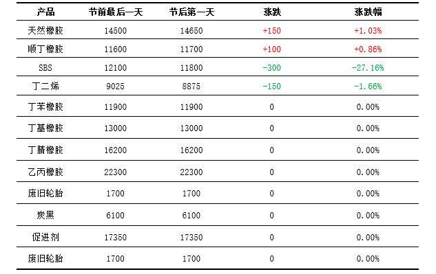 年双节期间,国内橡胶商品市场涨跌互现。其中,天然橡胶、顺丁橡胶呈现上涨,主要原因为天气带动胶水价格及顺丁橡胶存在标品供应紧张,且超跌后心态改变。
